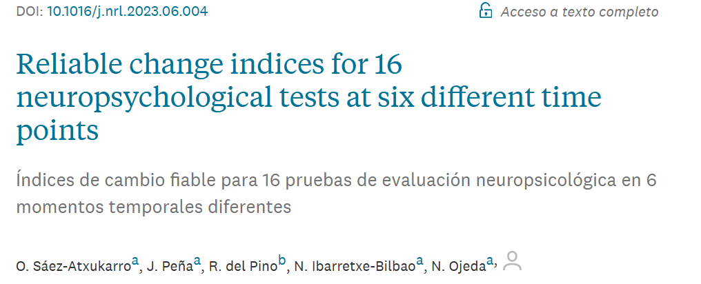 - Sáez-Atxukarro, O., Peña, J., Del Pino, R., Ibarretxe-Bilbao, N., y Ojeda, N. Índices de cambio fiable para evaluar cambios cognitivos en seguimientos a largo plazo. XIV Congreso de la Federación de Asociaciones de Neuropsicología Españolas (FANPSE). 15-17 de Junio de 2023.